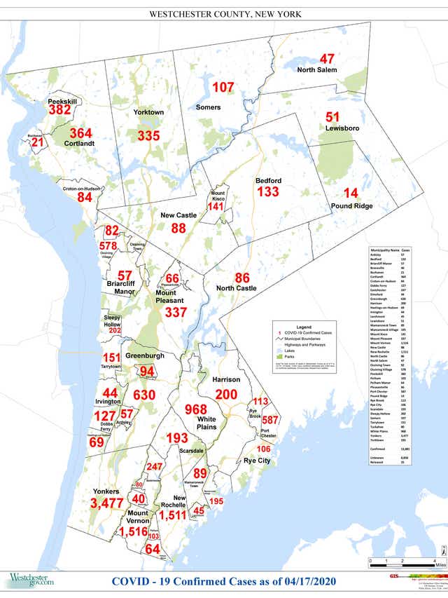 Here are the number of COVID-19 cases town by town in Westchester through April 17.